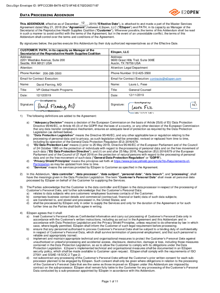 Este Addendum, efectivo a partir de diciembre _____, 2019, se adjunta y forma parte del Acuerdo de Servicios Maestros entre E2open, LLC y PATH, en su capacidad como Gerente de la Secretaría de la Coalición de Suministros de Salud Reproductiva. El Addendum establece las condiciones bajo las cuales E2open procesará los datos personales del Cliente y se compromete a cumplir con la legislación de protección de datos aplicable.