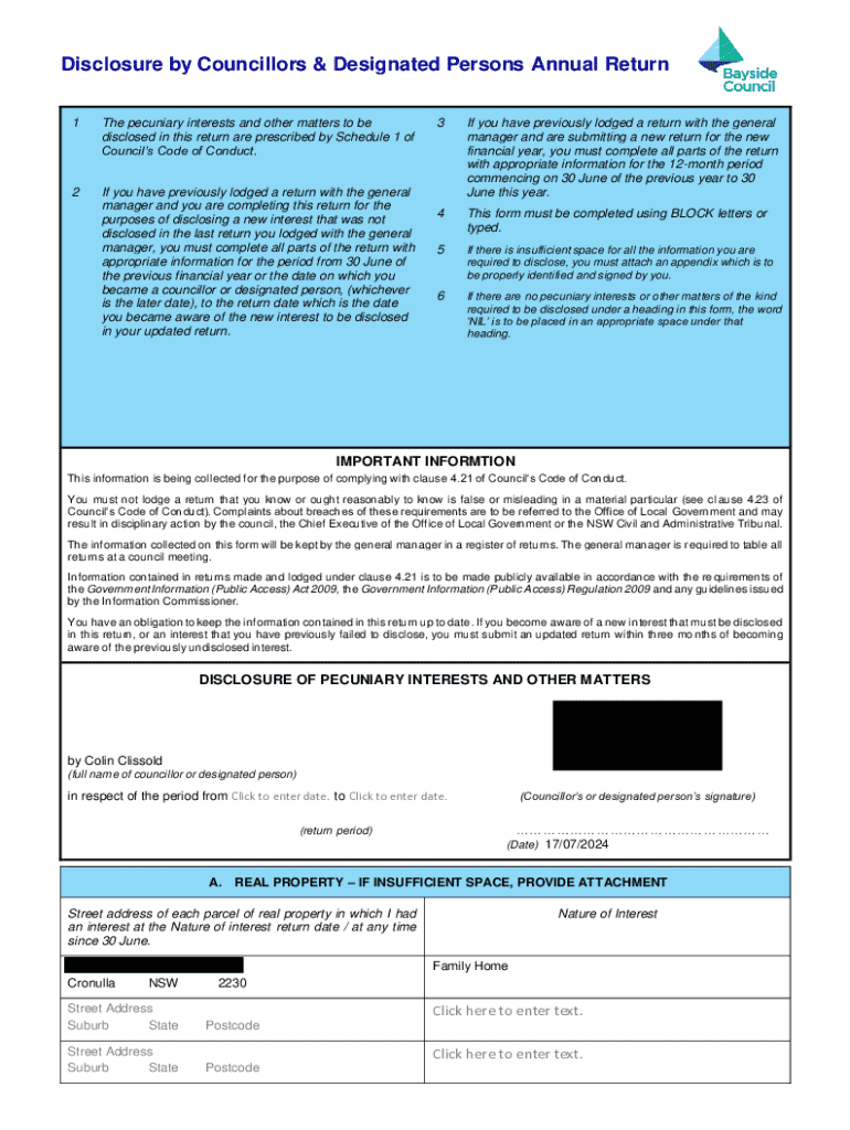Disclosure by Councillors & Designated Persons Annual Return 1The pecuniary interests and other matters to be disclosed in this return are prescribed by Schedule 1 of Councils Code of Conduct.2If