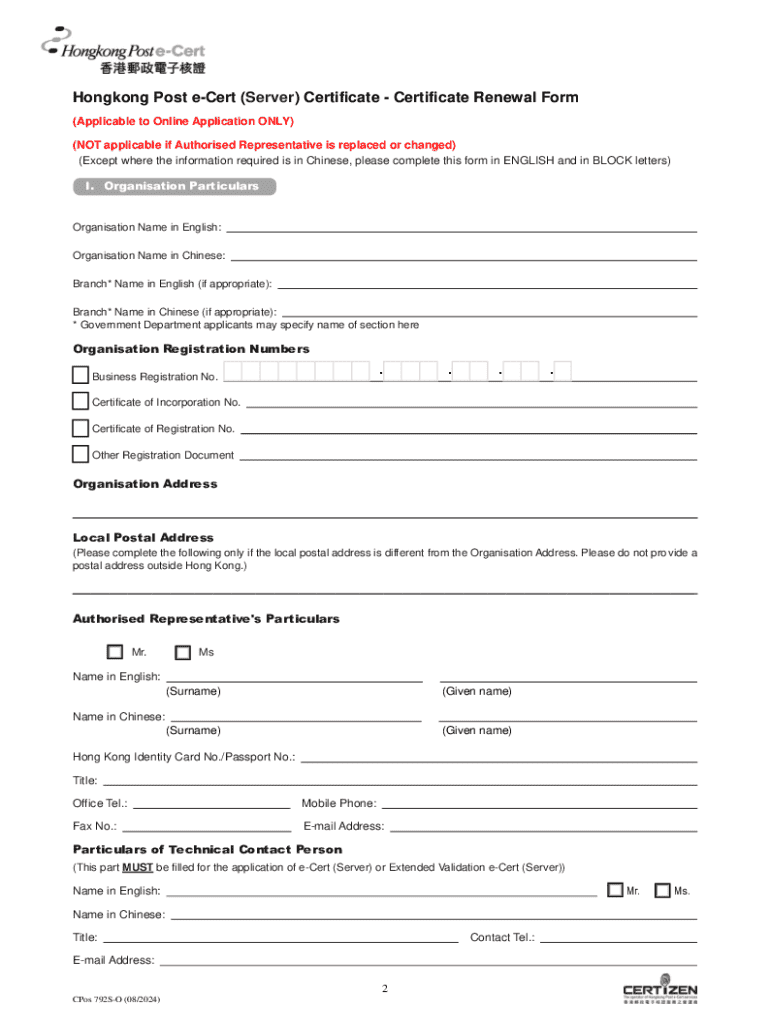 Este formulario de renovación es solo aplicable para la presentación en línea de la solicitud de e-Cert (Servidor) con Representante Autorizado sin cambios. Este proceso incluye la re-autenticación de la identidad de la organización suscriptora y del Representante Autorizado, así como la presentación de documentos de apoyo necesarios junto con el formulario completado.