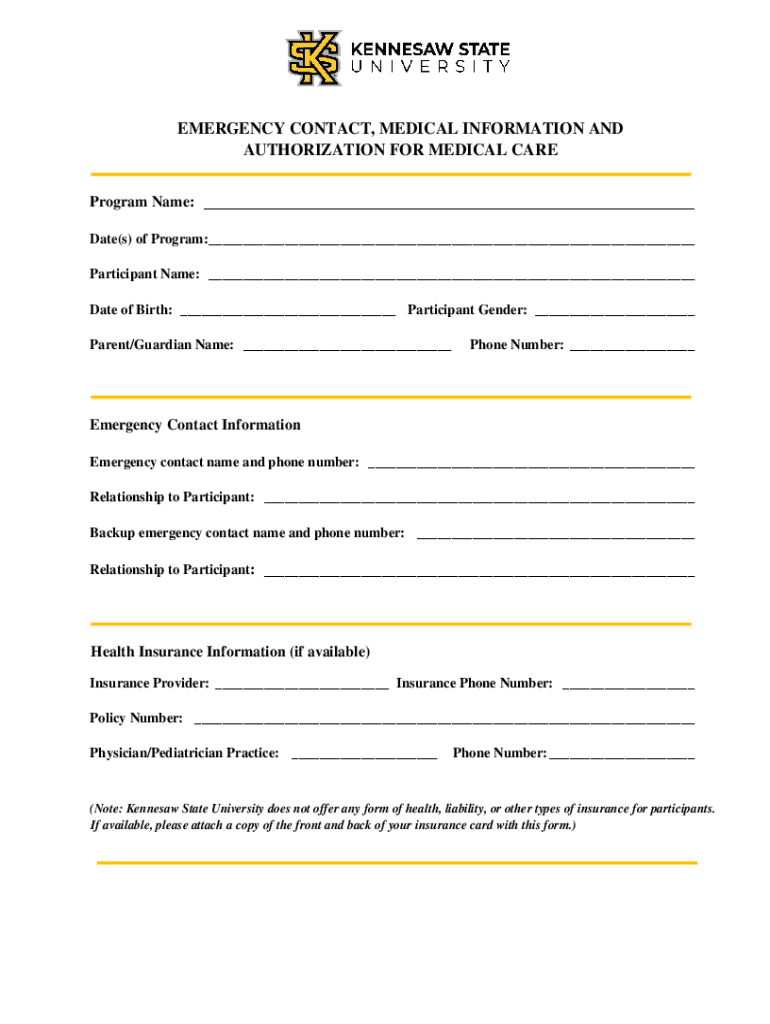 This document collects essential information related to emergency contacts, medical history, and consent for medical treatment for participants in a program. It ensures that caregivers provide necessary health information and authorize medical care if needed.