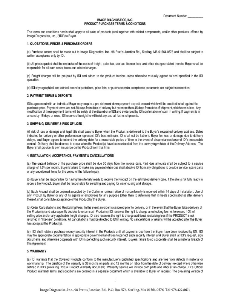 Document Number ___ IMAGE DIAGNOSTICS, INC. PRODUCT PURCHASE TERMS & CONDITIONS The terms and conditions herein shall apply to all sales of products (and together with related components, and/or other