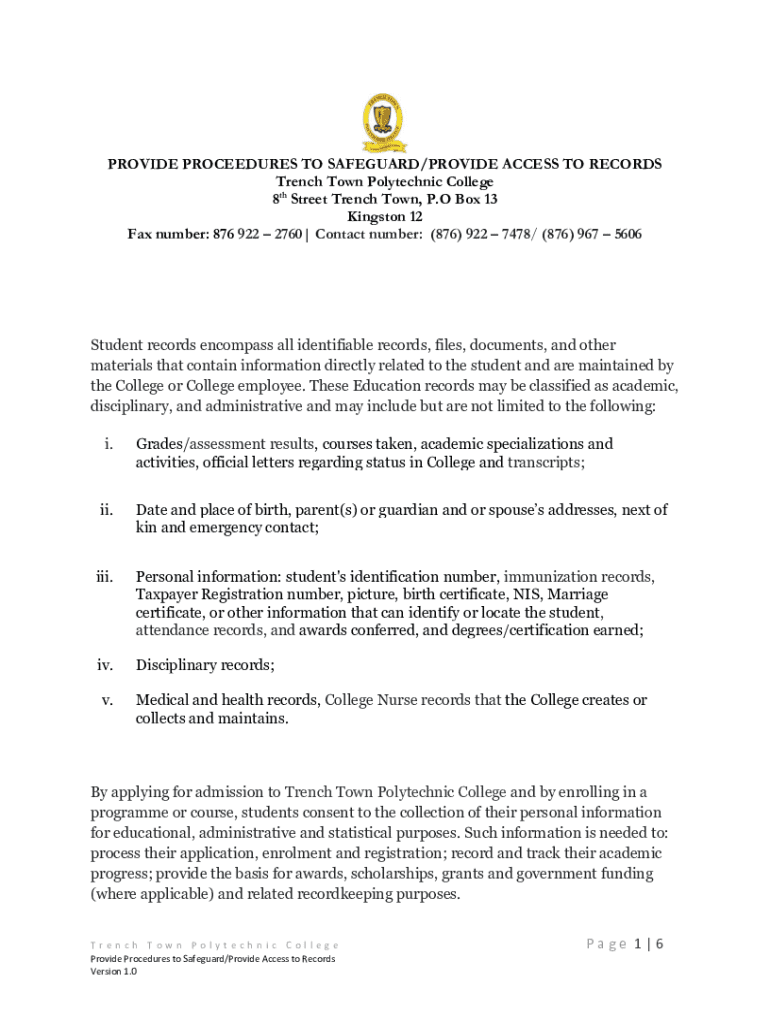This document outlines the procedures for safeguarding and providing access to student records at Trench Town Polytechnic College. It details the types of records maintained, the policy for access, security measures, and the protocol for requesting records.