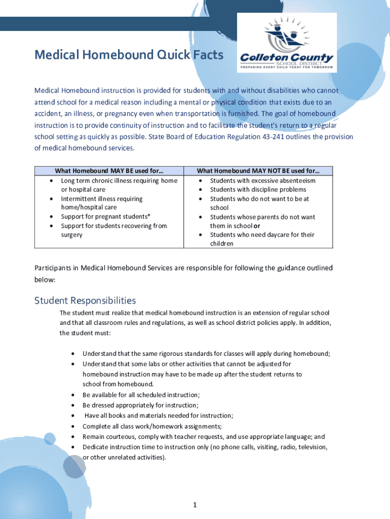 Medical Homebound Quick Facts Medical Homebound instruction is provided for students with and without disabilities who cannot attend school for a medical reason including a mental or physical condition