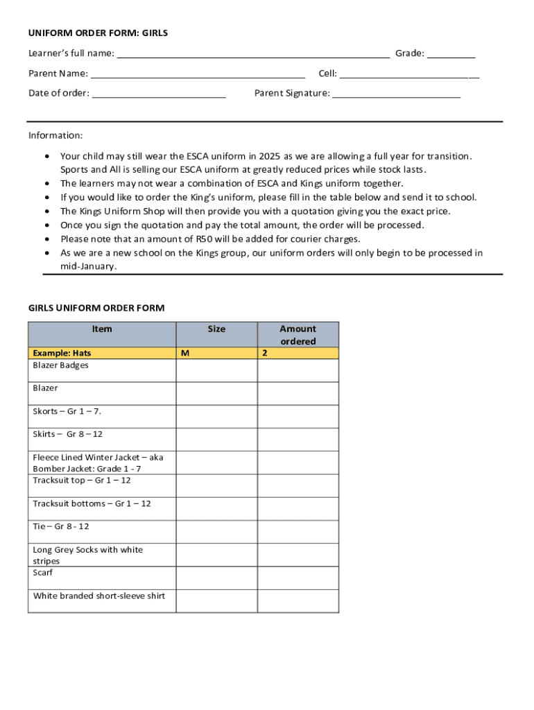 UNIFORM ORDER FORM: GIRLS Learners full name: ___ Grade: ___ Parent Name: ___ Date of order: ___Cell: ___Parent Signature: ___Information: Your child may still wear the ESCA uniform in 2025 as we