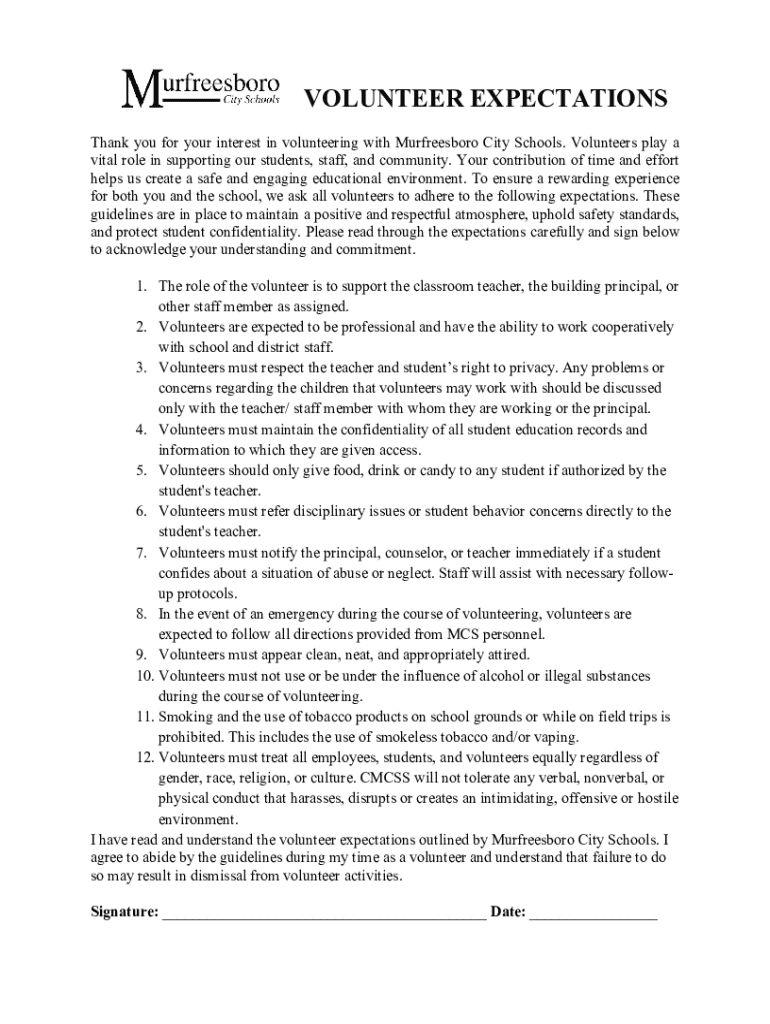 El documento detalla las expectativas y responsabilidades de los voluntarios en las Escuelas de la Ciudad de Murfreesboro, enfatizando la importancia de mantener un ambiente seguro y respetuoso para los estudiantes y el personal. También incluye un formulario de solicitud que recopila información personal y antecedentes del solicitante para garantizar la seguridad de los estudiantes.
