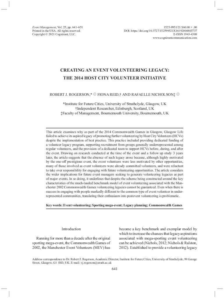Cet article examine pourquoi, dans le cadre des Jeux du Commonwealth de 2014 à Glasgow, Glasgow Life n\'a pas réussi à atteindre son objectif de promouvoir davantage le bénévolat parmi les bénévoles de la ville hôte, malgré la mise en œuvre de pratiques exemplaires. Il discute des implications plus larges pour les futurs gestionnaires d\'événements cherchant à générer des legs de bénévolat dans le cadre d\'événements majeurs.