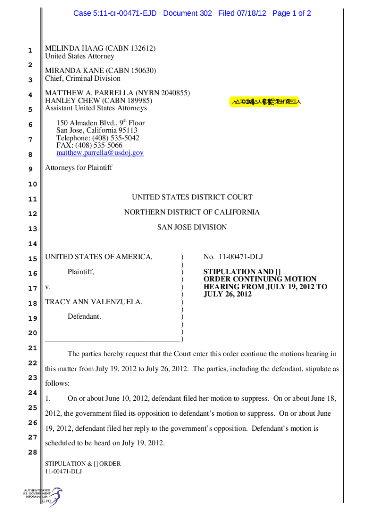 This document contains a stipulation by the parties involved in the case regarding the continuance of a motion hearing from July 19, 2012, to July 26, 2012, due to the unavailability of government counsel. It outlines the timeline of the motion to suppress filed by the defendant and details the agreement reached by the parties.
