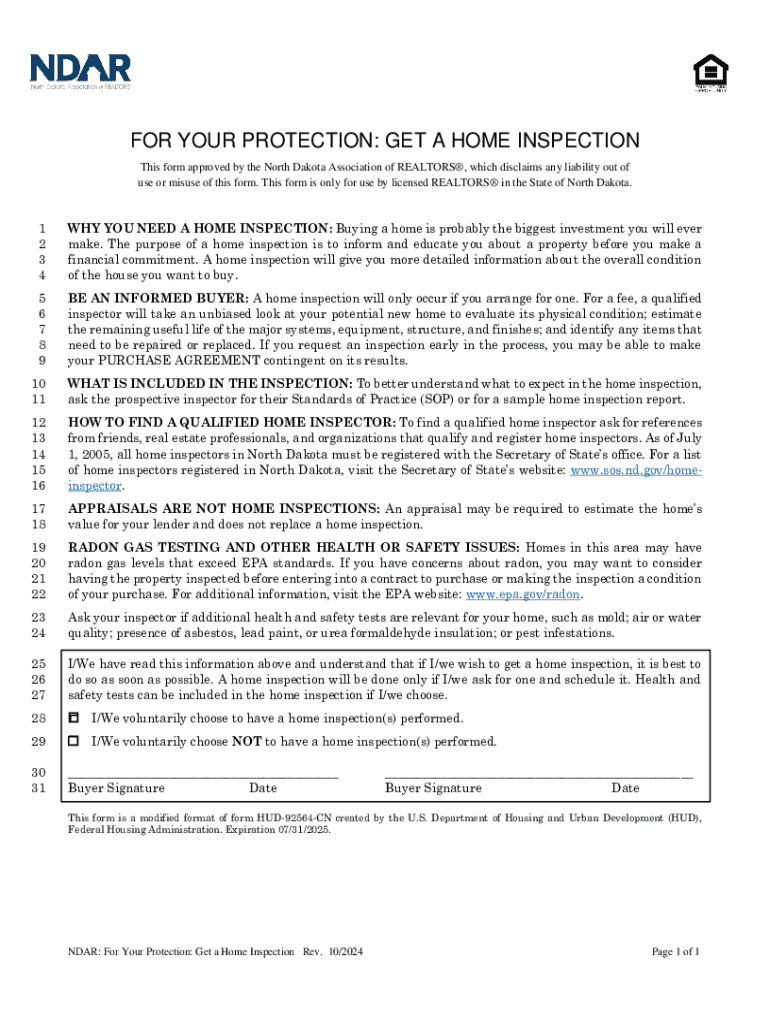 Este formulario aprobado por la Asociación de REALTORS® de Dakota del Norte informa sobre la importancia de realizar una inspección del hogar antes de hacer una compra. Detalla cómo un inspector calificado evaluará la condición física de la propiedad y qué incluir en la inspección.