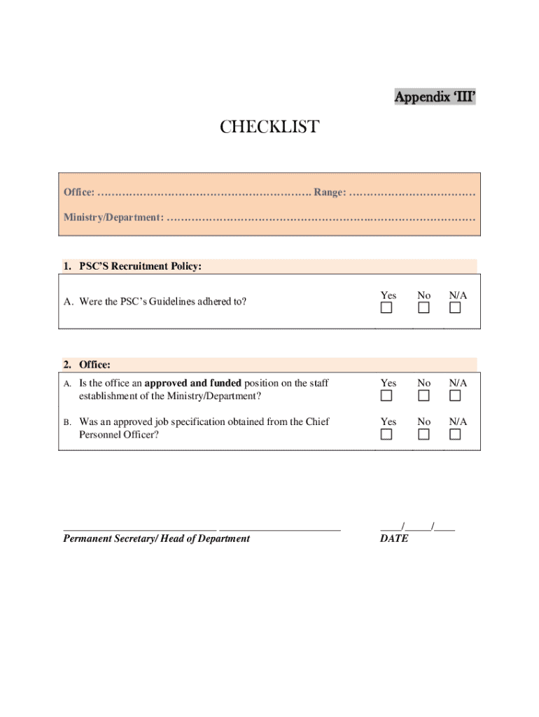 This document serves as a checklist to ensure adherence to the PSC\'s Recruitment Policy, confirming details regarding positions and job specifications within ministries and departments.