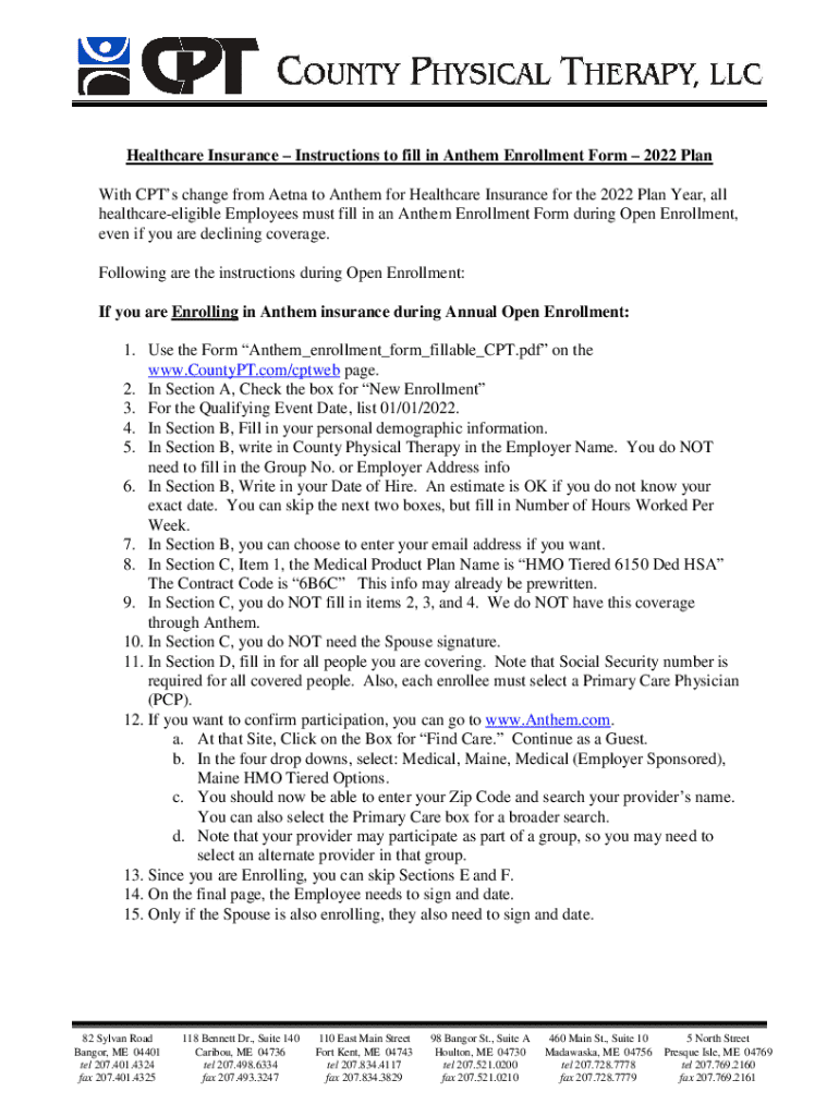 Instructions for employees on how to fill out the Anthem Enrollment Form during Open Enrollment for the 2022 Plan Year, including steps for enrolling, declining coverage, and newly eligible employees.