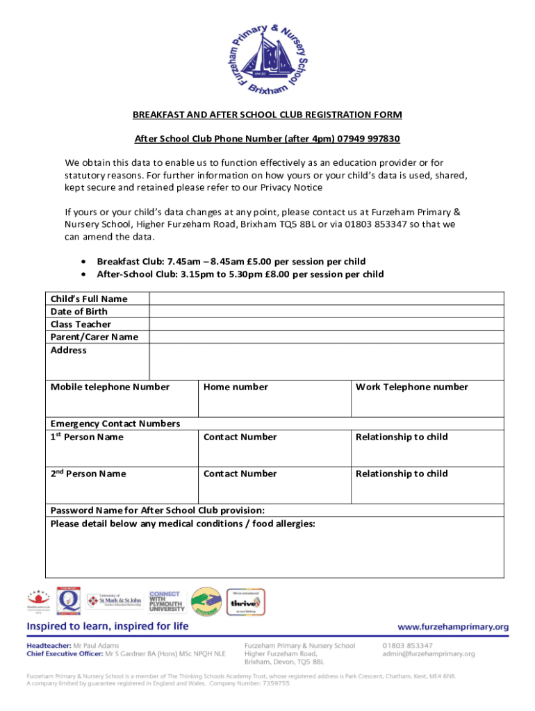 BREAKFAST AND AFTER SCHOOL CLUB REGISTRATION FORM After School Club Phone Number (after 4pm) 07949 997830 We obtain this data to enable us to function effectively as an education provider or for statutory