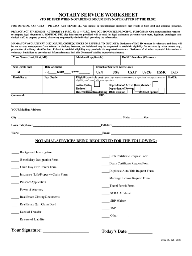 DOD Navy JAG Corps Notary Service Worksheet 2025-2026 free printable template