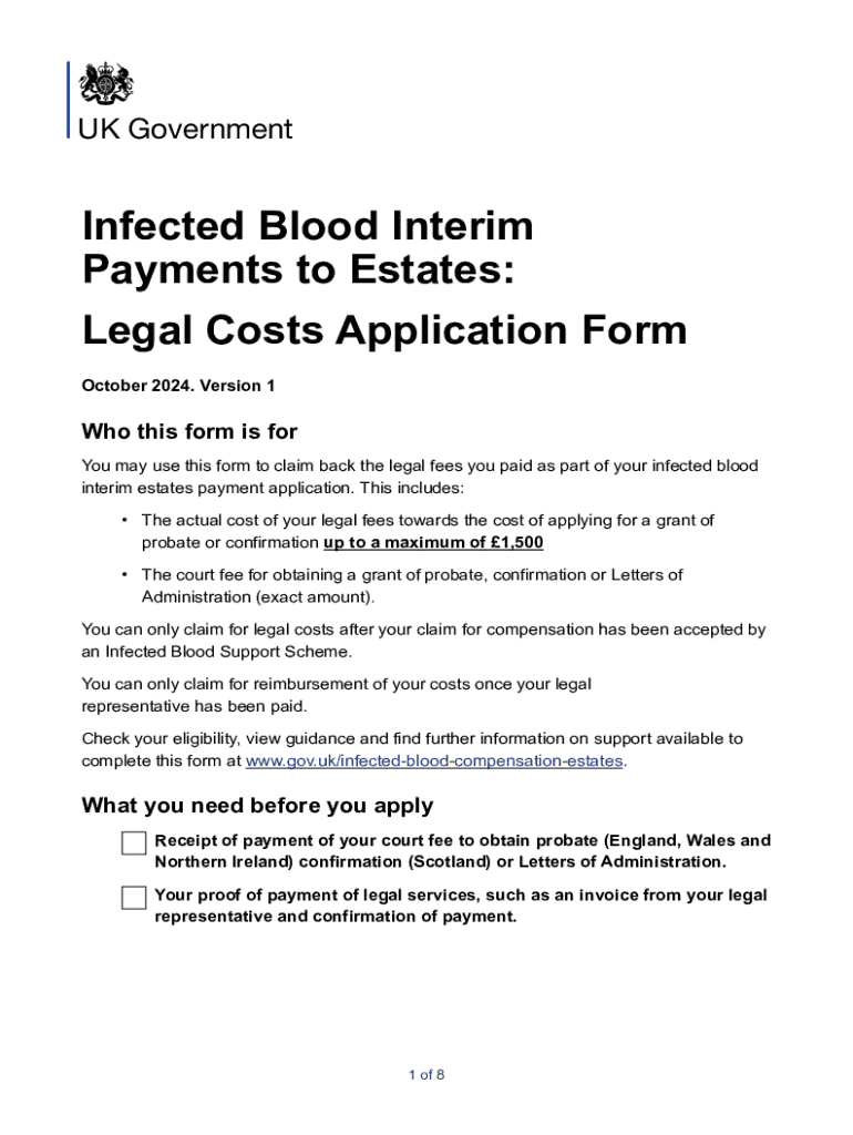 Este formulario se utiliza para reclamar los costos legales pagados como parte de la solicitud de pago interino de herencias por sangre infectada. Se puede reclamar hasta un máximo de £1,500 por honorarios legales relacionados con la obtención de un testamento o confirmación y los costos del tribunal asociados.