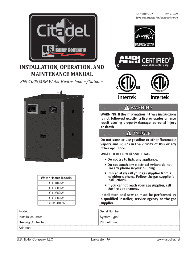PN: 11195902 Rev. 3, 6/24 Save this manual for future reference.INSTALLATION, OPERATION, AND MAINTENANCE MANUAL 3991000 MBH Water Heater Indoor/Outdoor TE I TA TI O N LISDSAN WARNING WARNING: If the