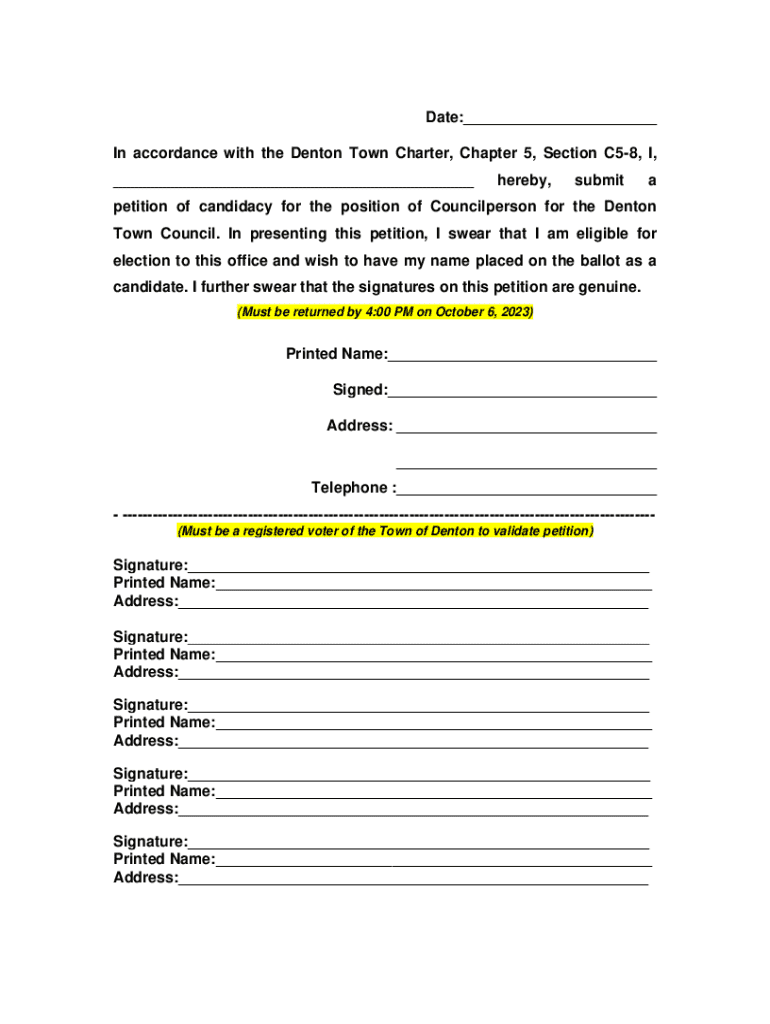 Date:___ In accordance with the Denton Town Charter, Chapter 5, Section C58, I, ___hereby,submitapetition of candidacy for the position of Councilperson for the Denton Town Council. In presenting