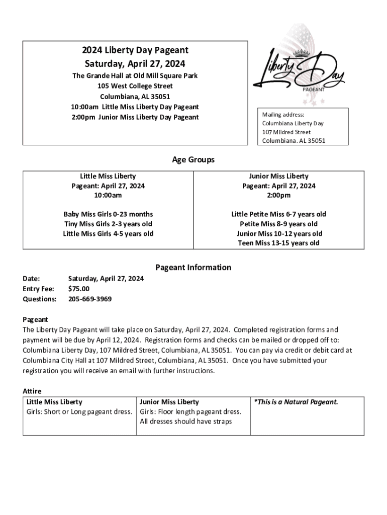 This document contains information and registration forms for the 2024 Liberty Day Pageant, including details on age groups, attire, pageant rules, and registration procedures.