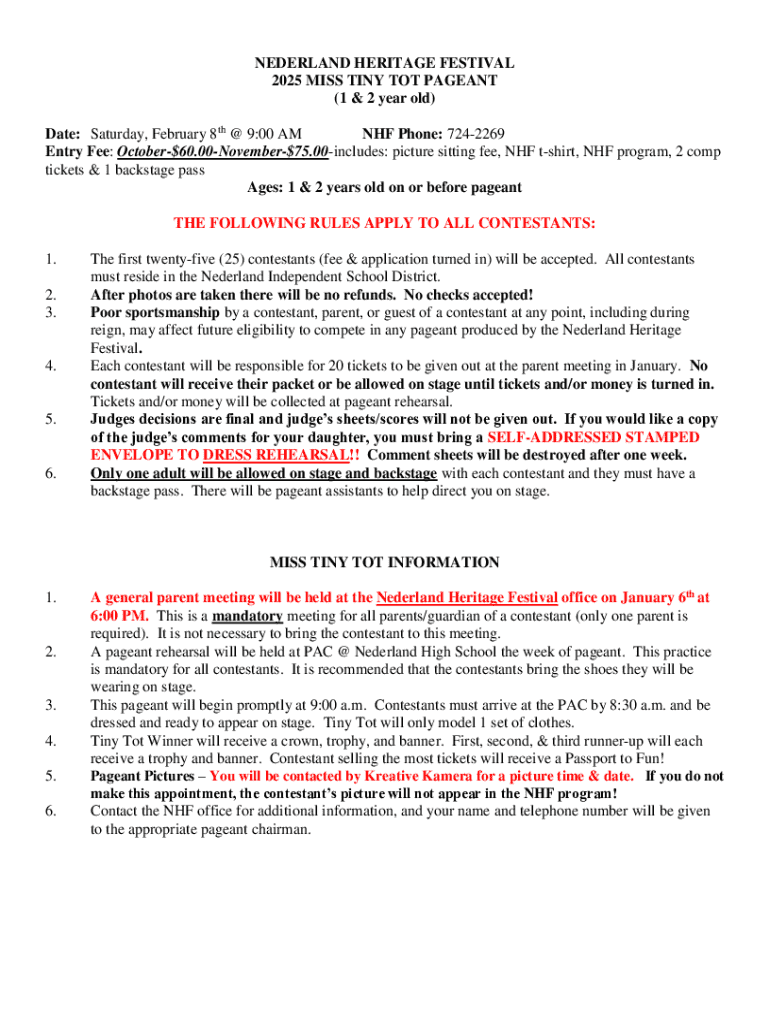 Application form for participating in the 2025 Miss Tiny Tot Pageant for children aged 1 and 2 years old, held during the Nederland Heritage Festival. Includes details on entry fee, rules, relevant meetings, and participation requirements.