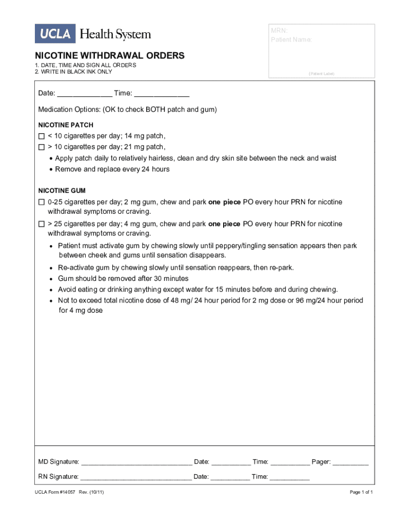 MRN: Patient Name:NICOTINE WITHDRAWAL ORDERS 1. DATE, TIME AND SIGN ALL ORDERS 2. WRITE IN BLACK INK ONLY(Patient Label)Date: ___ Time: ___ Medication Options: (OK to check BOTH patch and gum) NICOTINE