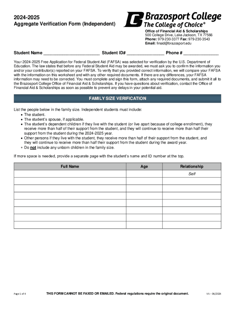 Este formulario se utiliza para verificar la información reportada en la Solicitud Gratuita de Ayuda Federal para Estudiantes (FAFSA) para el año académico 2024-2025. Se requiere que los estudiantes completen y firmen este formulario, adjunten cualquier documento requerido y lo envíen a la Oficina de Ayuda Financiera y Becas de Brazosport College.