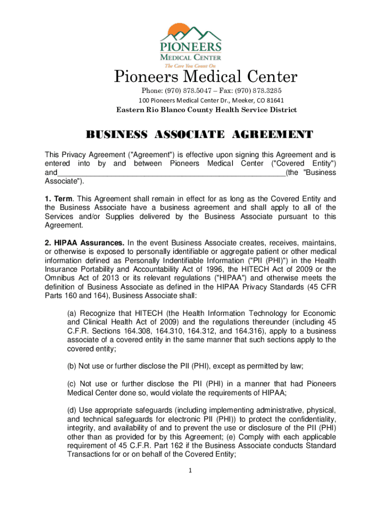 This Business Associate Agreement establishes the terms between Pioneers Medical Center and the Business Associate concerning the handling of Protected Health Information (PHI) in compliance with HIPAA regulations.