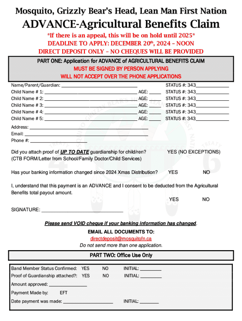Mosquito, Grizzly Bears Head, Lean Man First NationADVANCEAgricultural Benefits Claim *If there is an appeal, this will be on hold until 2025* DEADLINE TO APPLY: DECEMBER 20th, 2024 NOON DIRECT DEPOSIT