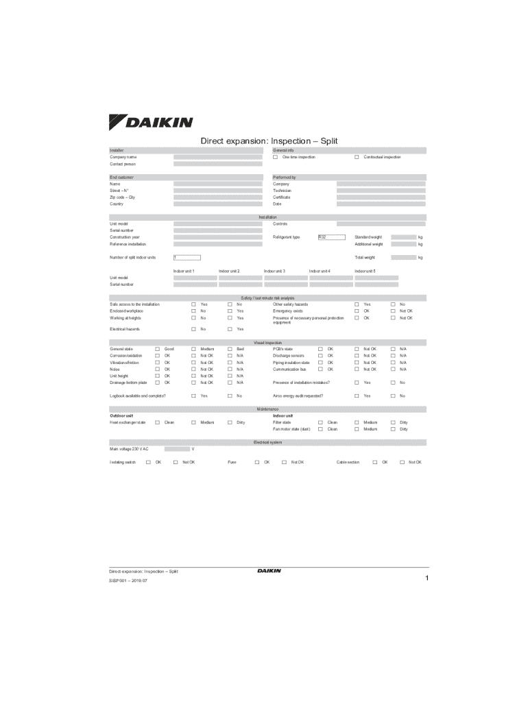 Direct expansion: Inspection Split InstallerGeneral infoCompany nameOne time inspectionContractual inspectionContact person End customerPerformed byNameCompanyStreet NTechnicianZip code CityCertificateCountryDate
