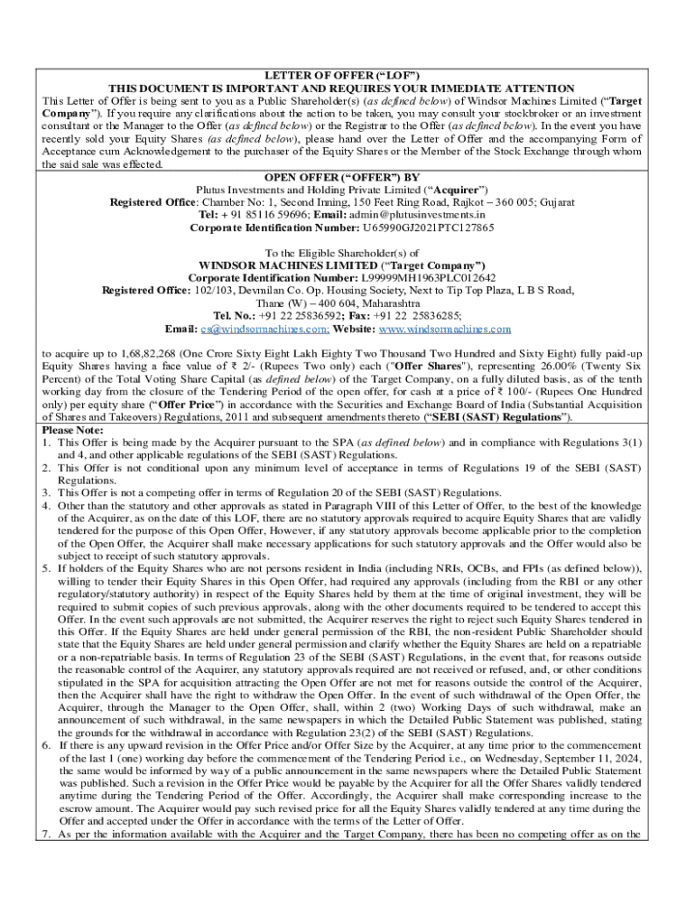 This Letter of Offer is being sent to the Public Shareholder(s) of Windsor Machines Limited concerning the Open Offer to acquire up to 1,68,82,268 fully paid-up Equity Shares, representing 26.00% of the Total Voting Share Capital of Windsor Machines Limited for cash at a price of ₹ 100/- per share.