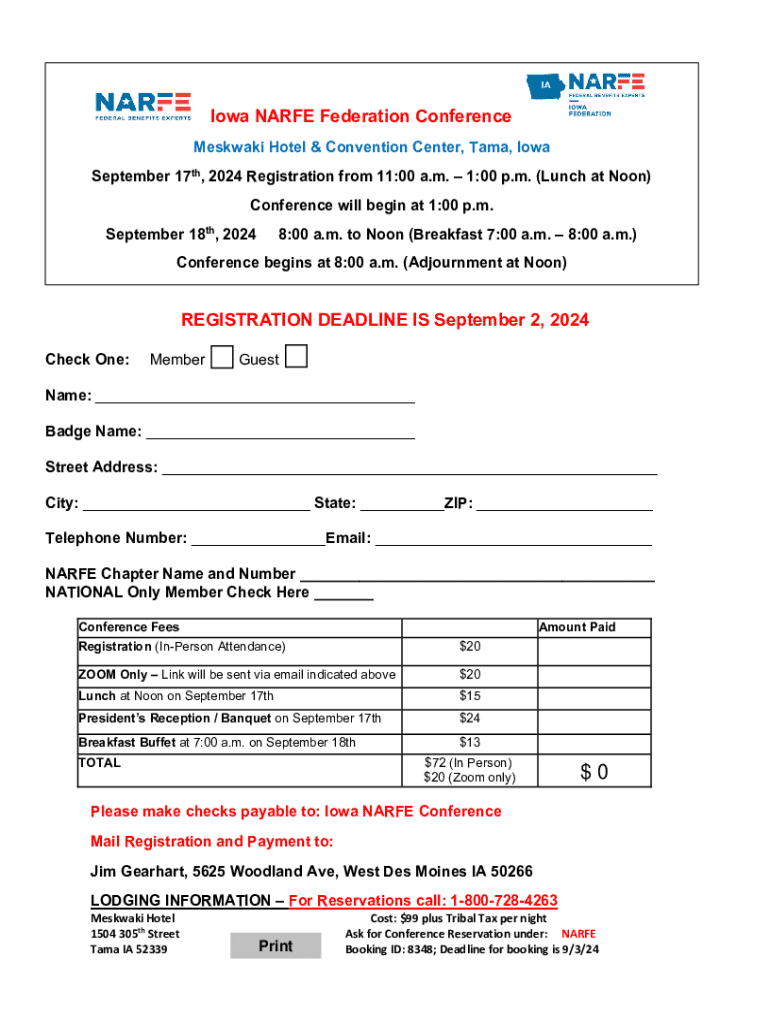 Registration form for the Iowa NARFE Federation Conference taking place at the Meskwaki Hotel & Convention Center in Tama, Iowa from September 17th to September 18th, 2024. This form includes sections for personal details, payment options, and conference fees.