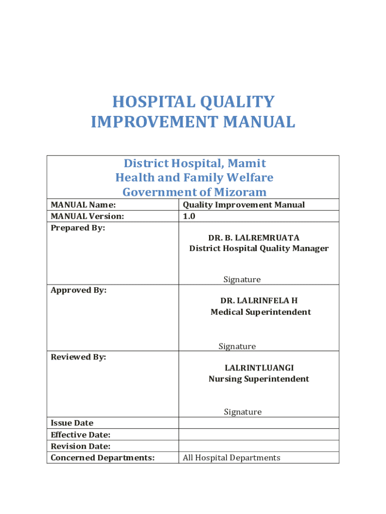 A hospital quality improvement manual is a comprehensive document that outlines the standards, procedures, and practices aimed at enhancing the quality of care and patient safety within a hospital setting.