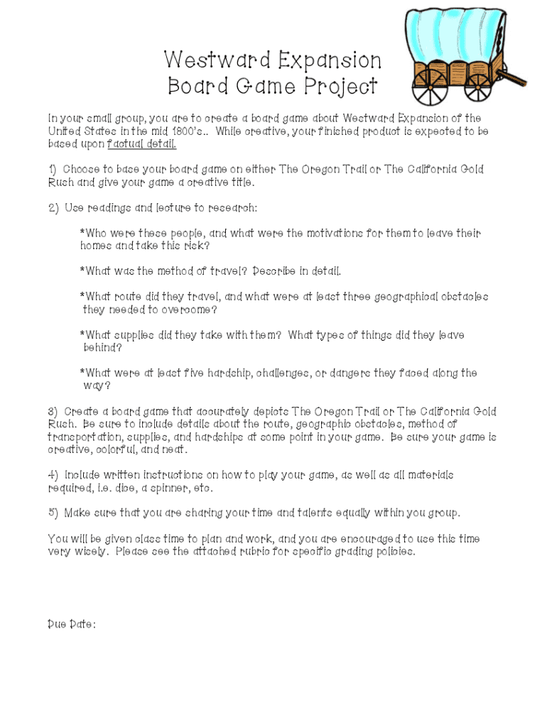 In this project, groups create a board game based on either The Oregon Trail or The California Gold Rush, incorporating factual details about motivations, travel methods, routes, geographical obstacles, supplies, hardships, and gameplay instructions.