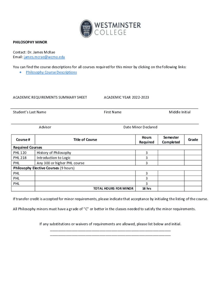 To fill out a philosophy minor, students must complete the required paperwork as specified by their academic institution, which may include indicating their chosen courses and obtaining necessary signatures.