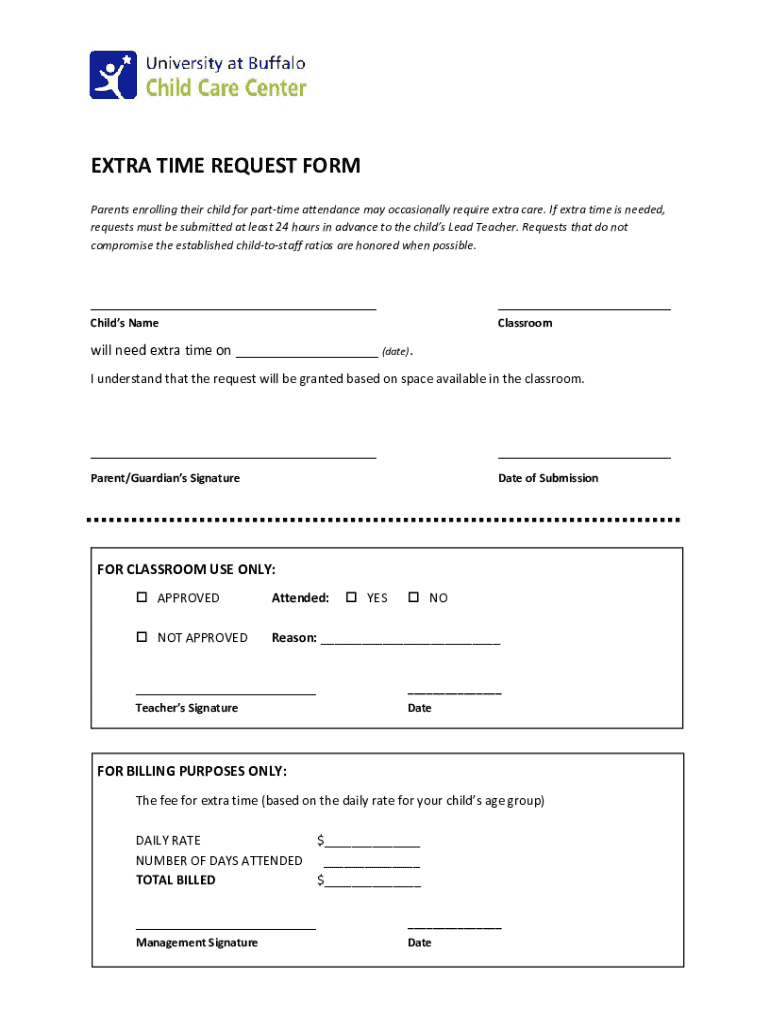 This form is used by parents to request extra care for their child requiring part-time attendance. Requests must be submitted 24 hours in advance to the child\'s Lead Teacher, and will be honored based on availability and compliance with child-to-staff ratios.