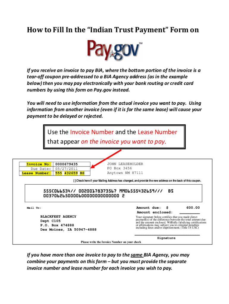 Este documento proporciona instrucciones sobre cómo completar el formulario de \'Pago de Fideicomiso Indio\' utilizando información de una factura del BIA. Se detalla cómo realizar un pago electrónico a través de Pay.gov, los campos necesarios que deben completarse, y advertencias sobre el uso de información incorrecta que puede causar retrasos o rechazos en el pago.