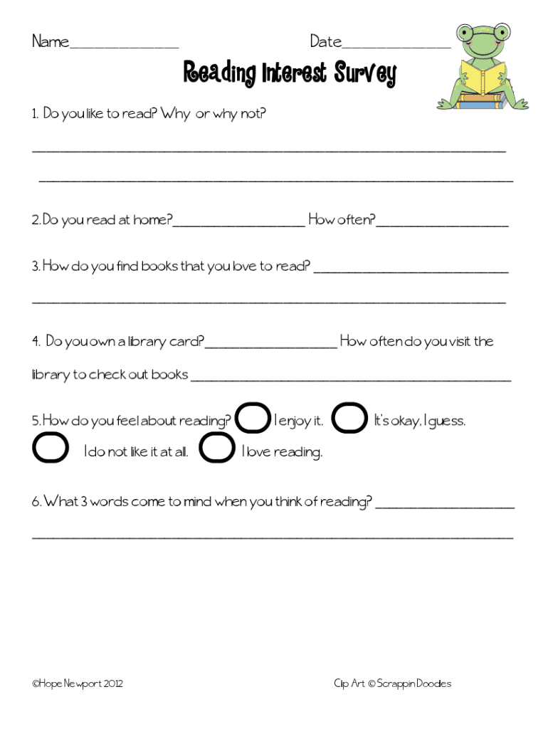 Typically, participants such as students, teachers, or members of a reading program are required to file a reading interest survey to provide insights for curriculum or program development.