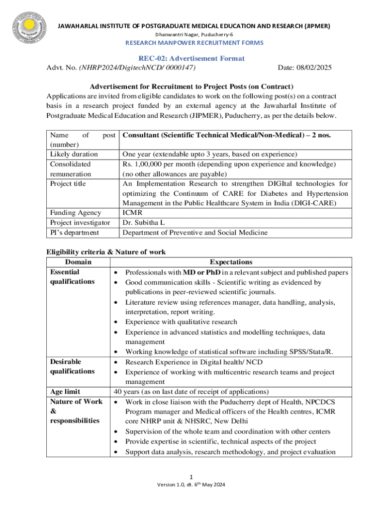 This document outlines the recruitment process for the post of Consultant (Scientific Technical Medical/Non-Medical) at JIPMER as part of a research project focused on diabetes and hypertension management. It details the eligibility criteria, nature of work, salary, and instructions for application submission.
