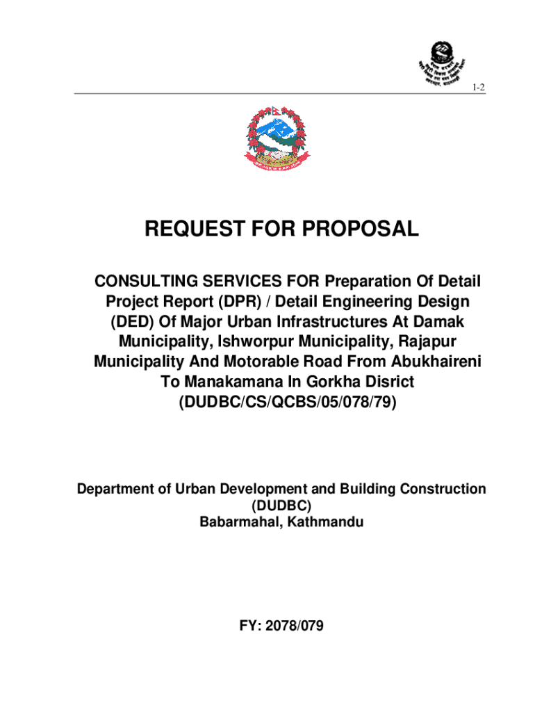 This document outlines a Request for Proposals for consulting services to prepare detailed project reports and designs for major urban infrastructures at various municipalities and a motorable road in Gorkha District, Nepal. It includes terms of reference, instructions for consultants, proposal requirements, and evaluation criteria.