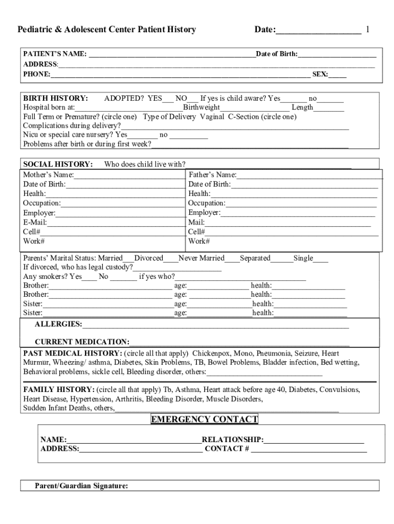 A comprehensive form used to gather patient history for pediatric and adolescent patients, including birth history, social history, allergies, current medications, and family medical history.