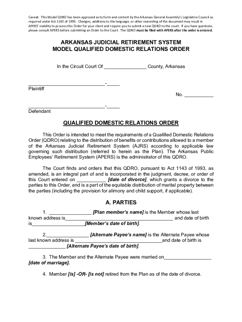 Caveat: This Model QDRO has been approved as to form and content by the Arkansas General Assemblys Legislative Council as required under Act 1143 of 1993. Changes, additions to the language, or other