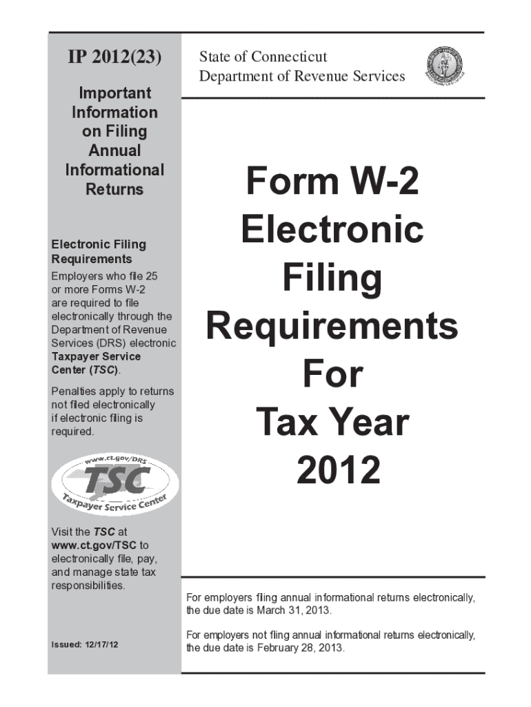 Este documento contiene especificaciones e instrucciones para presentar electrónicamente la información del Formulario W-2 al Departamento de Servicios de Ingresos de Connecticut. Describe los requisitos de presentación electrónica, plazos y penalizaciones para los empleadores que fichan 25 o más formularios W-2.