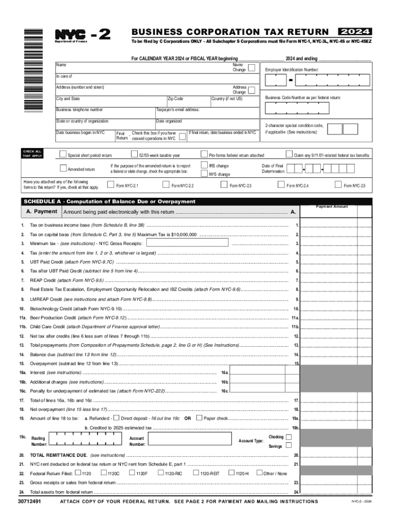 Form NYC-2 is the Business Corporation Tax Return to be filed exclusively by C Corporations for the calendar year 2024 or the fiscal year beginning in 2024. The form requires corporation-specific information including name, address, Employer Identification Number (EIN), tax calculations, and various credits and payments relevant to business income and capital base.