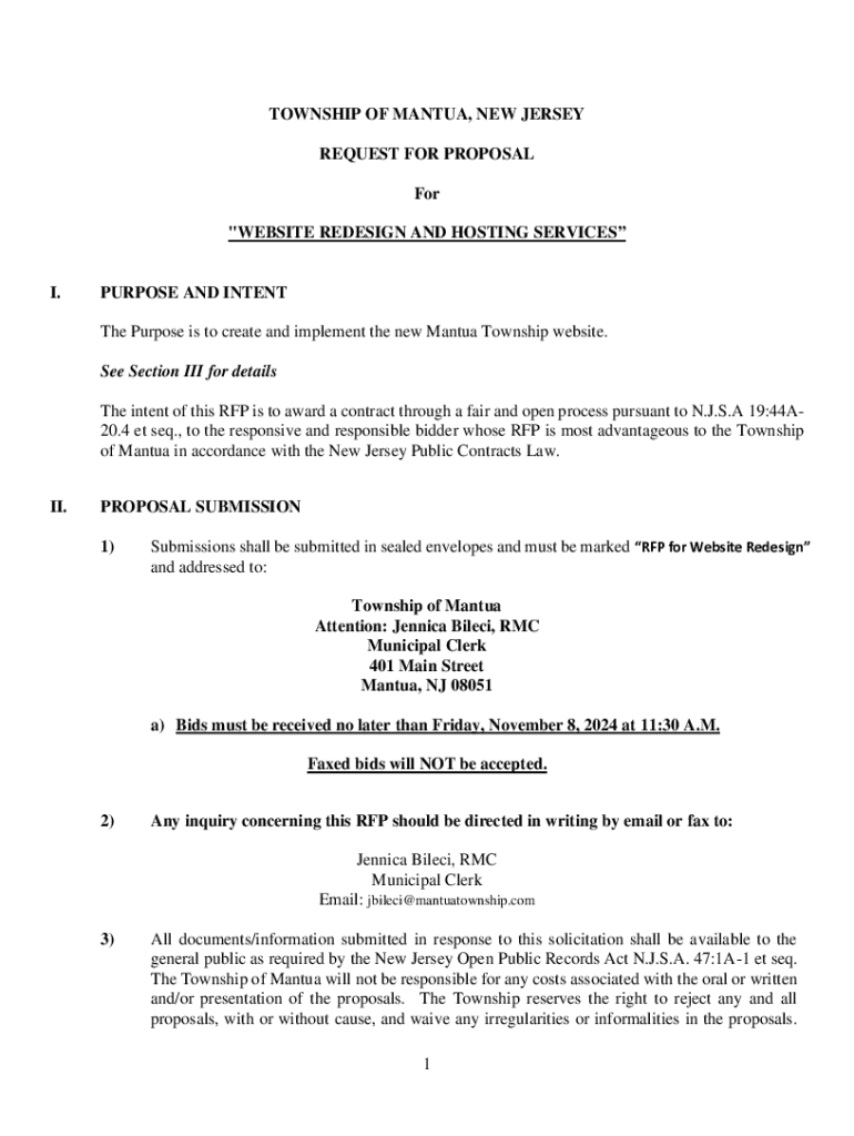 This RFP aims to select a contractor to create and implement a new website for Mantua Township, including technical upgrades, improved user experience, payment capabilities, mobile compatibility, and ongoing support.