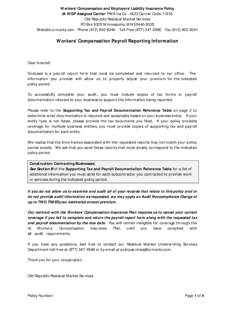 Workers Compensation and Employers Liability Insurance Policy IA WCIP Assigned Carrier: PMA Ins Co NCCI Carrier Code 11916 Old Republic Residual Market Services PO Box 9325 Minneapolis, MN 554409325