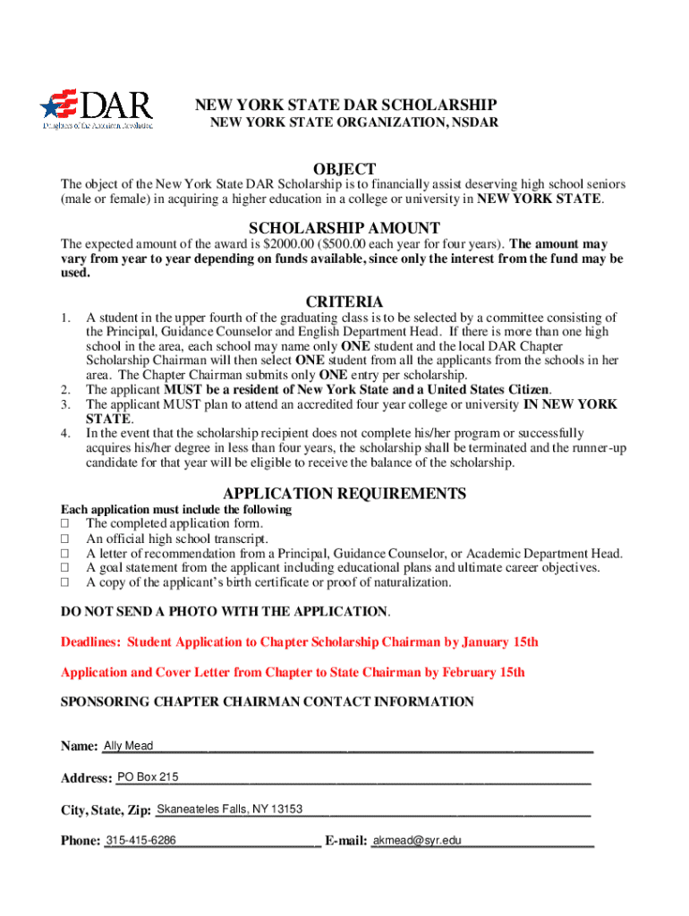 El objeto de la Beca DAR del Estado de Nueva York es ayudar financieramente a estudiantes de secundaria merecedores en la adquisición de una educación superior en un college o universidad en el Estado de Nueva York.