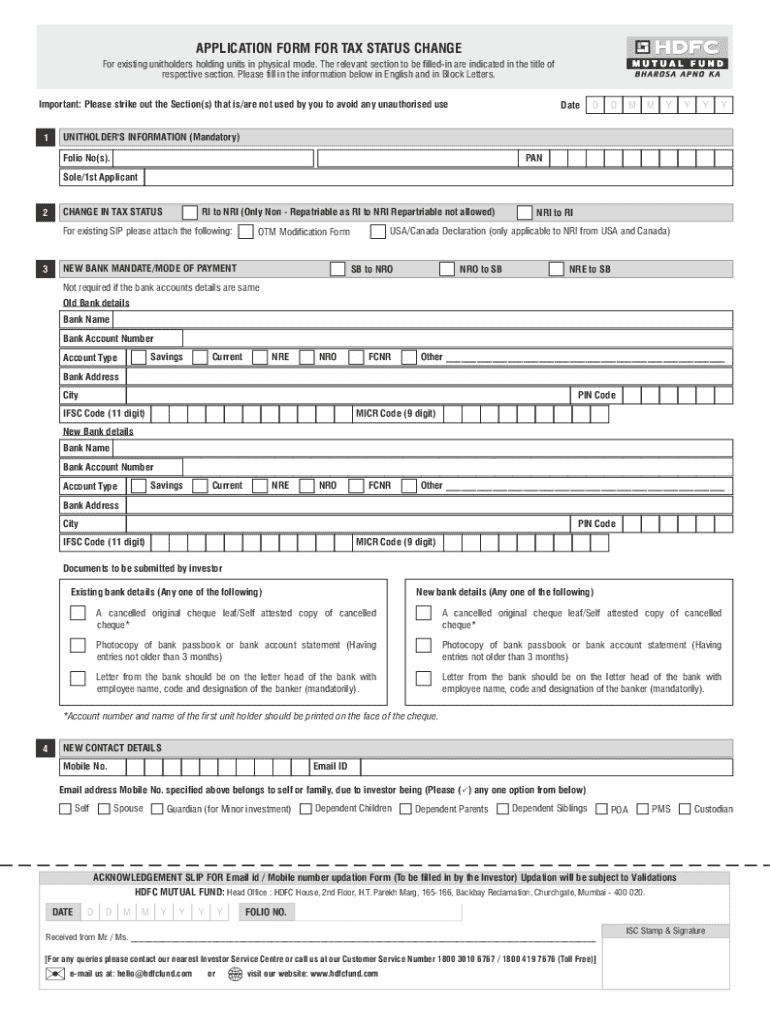 APPLICATION FORM FOR TAX STATUS CHANGE For existing unitholders holding units in physical mode. The relevant section to be filledin are indicated in the title of respective section. Please fill in