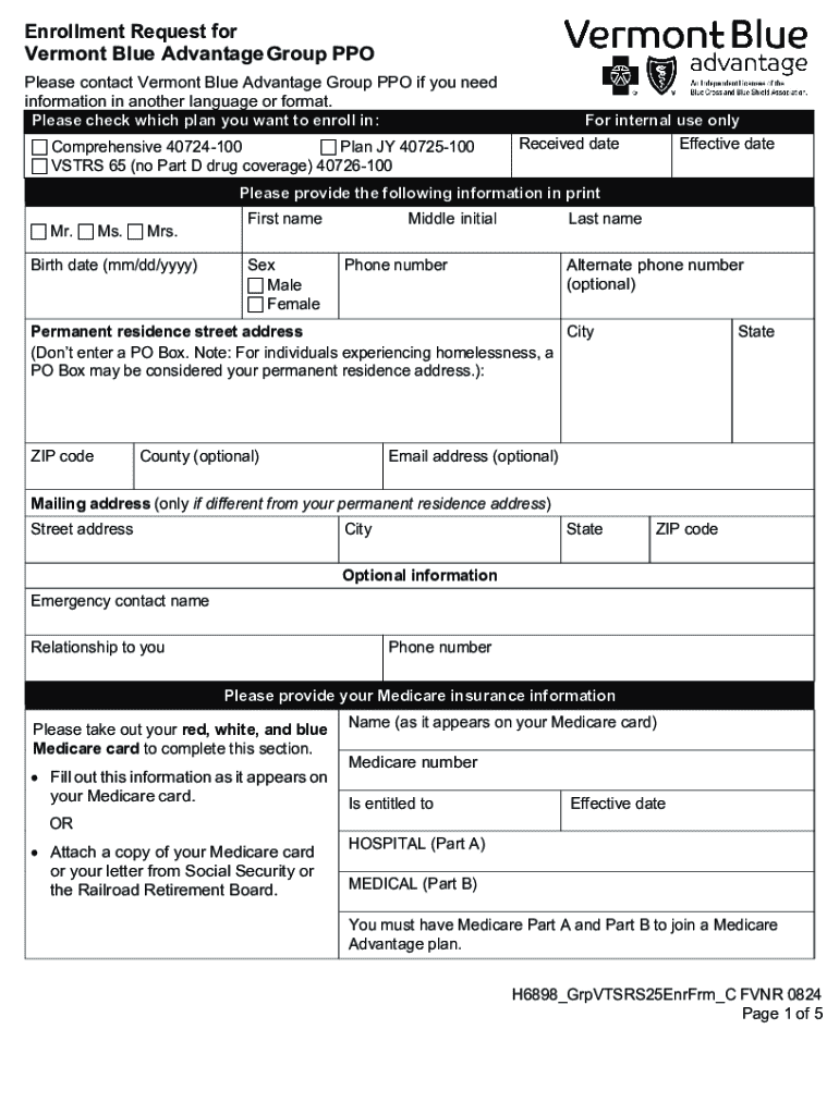 Este formulario es una solicitud de inscripción para el plan Medicare Advantage Vermont Blue Advantage Group PPO, donde los solicitantes pueden seleccionar un plan de atención médica y proporcionar información personal requerida para la inscripción.