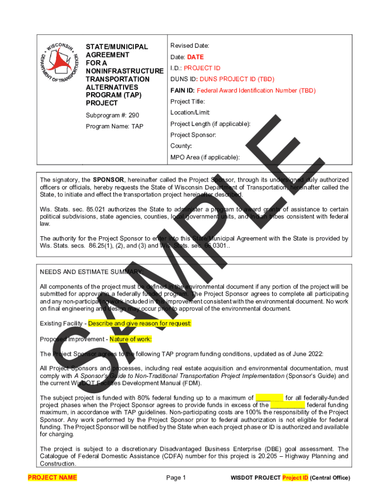 STATE/MUNICIPAL AGREEMENT FOR A NONINFRASTRUCTURE TRANSPORTATION ALTERNATIVES PROGRAM (TAP) PROJECT Subprogram #: 290 Program Name: TAPRevised Date: Date: DATE I.D.: PROJECT ID DUNS ID: DUNS PROJECT