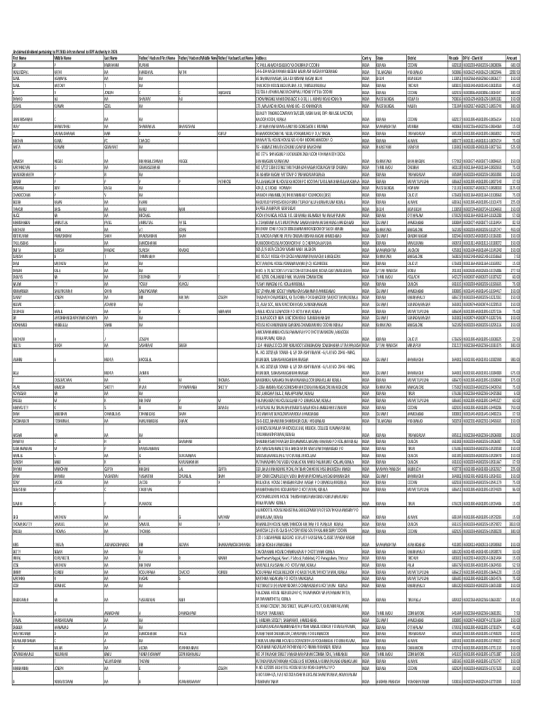 Unclaimed dividend pertaining to FY 201314 transferred to IEPF Authority in 2021 First Name Middle Name Last Name DR P KABRAHAM VENUGOPAL RATHI NA SUNIL AGARWAL NA SUNIL ANTONY T K V JOSEPH SHAHID