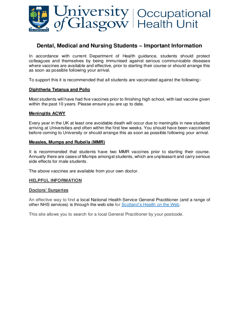 Dental, Medical and Nursing Students Important Information In accordance with current Department of Health guidance, students should protect colleagues and themselves by being immunised against serious communicable diseases where vaccines are available and effective, prior to starting their course or should arrange this as soon as possible following your arrival. To support this it is recommended that all students are vaccinated against the following:Diphtheria Tetanus and Polio Most students