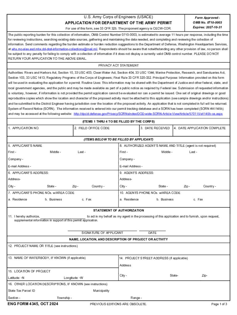 U.S. Army Corps of Engineers (USACE)Form Approved OMB No. 07100003 Expires: 20271031APPLICATION FOR DEPARTMENT OF THE ARMY PERMIT For use of this form, see 33 CFR 325. The proponent agency is CECWCOR.The