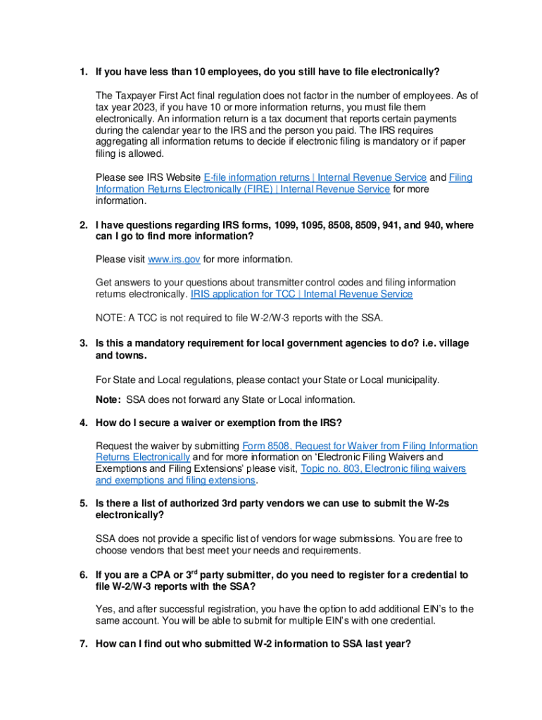 1. If you have less than 10 employees, do you still have to file electronically? The Taxpayer First Act final regulation does not factor in the number of employees. As of tax year 2023, if you have 10 or more information returns, you must file them electronically. An information return is a tax document that reports certain payments during the calendar year to the IRS and the person you paid. The IRS requires aggregating all information returns to decide if electronic filing is mandatory or...